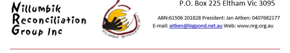 NRG has been cultivating and promoting reconciliation in our local community ever since encouraging individuals, schools, churches, businesses, community groups and Council to stand with, to celebrate and improve the lives of First Nations people through action and education. Many people have been involved over time but a core committee of volunteers continues to drive change in a gentle way. I would like to acknowledge the NRG Committee of volunteers.